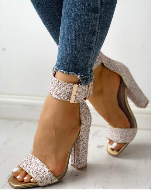 Stylish Sequin Open Toe Chunky Heeled Sandals